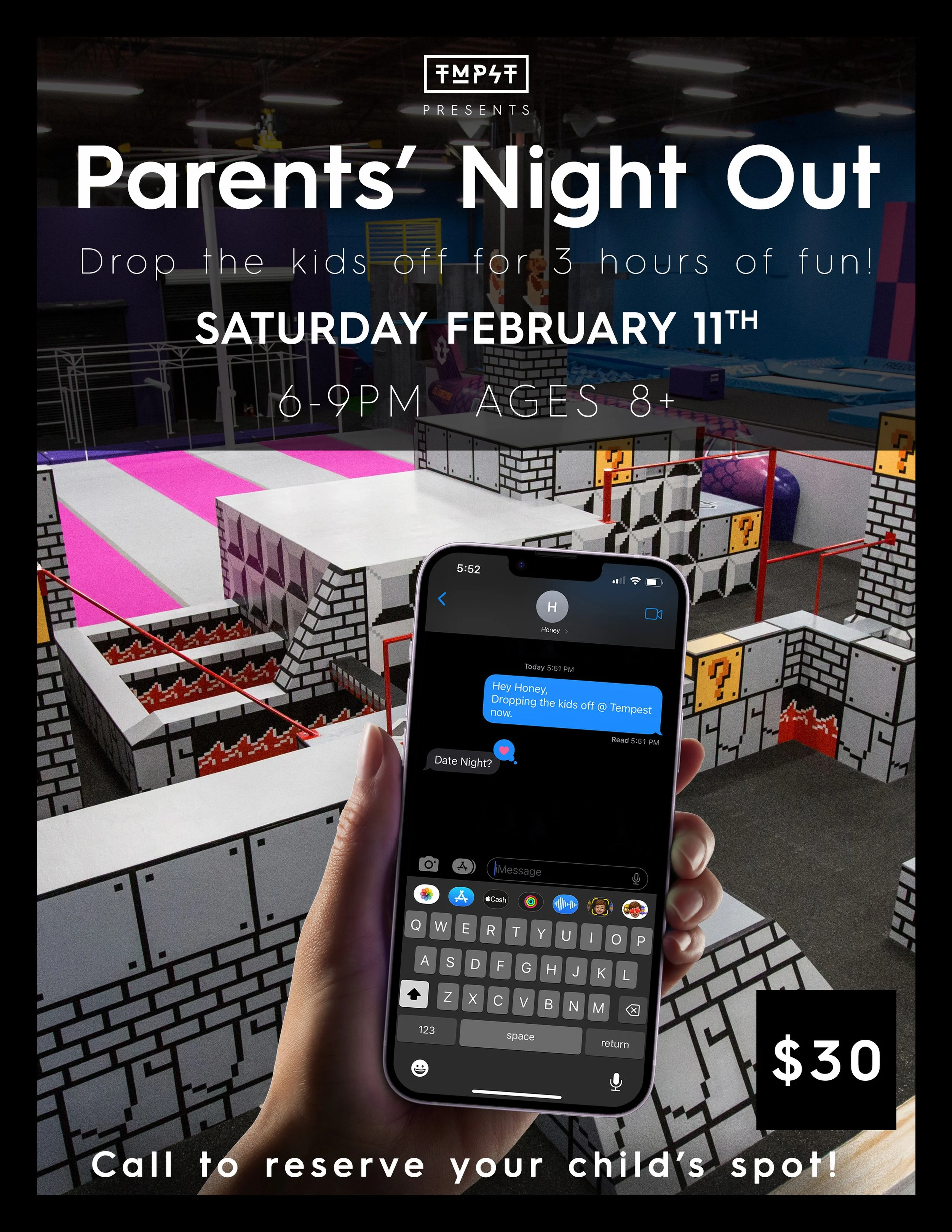 Parents drop your kids off for 3 hours of fun on Saturday 2/11 from 6-9pm while you spend quality time together!
